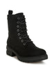 Lace-up platform ankle boots for women featuring grungy aesthetic with lug sole and low block heel. Edgy high ankle boots with pull tabs and cushioned insoles - perfect for fall, winter, and adding bold edge to any outfit.