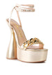 Step into show-stopping glamour with these stunning metallic platform sandals featuring a chunky gold chain strap and dramatic hourglass sky-high heel. Designed for the woman who loves bold, statement-making footwear, these sandals combine eye-catching metallic finish with unique hourglass heel design for a look that's both fierce and unforgettable.