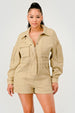 Utility romper for women featuring structured tailoring, cargo pockets, and cinched waist belt. Bold beige jumpsuit with military-inspired design perfect for elevated streetwear and confident style.