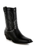 Embroidered studded cowboy boots for women featuring patterned embroidery detail and stud embellishments. Edgy western boots with low block heel and square toe - perfect for fall, winter, and adding western flair to any outfit.