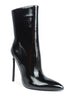 Patent leather ankle boots for women featuring pointed toe design and solid heel cap. Sleek high-heeled boots with elasticated gussets and side zipper - perfect for fall, winter, and adding shine to any outfit.