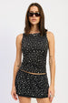 Shine bright in this metal hotfix knit tank top featuring eye-catching embellishments. Crafted from a premium blend of 87% nylon and 13% spandex, this contemporary crop top combines glamorous hotfix details with comfortable stretch for the modern woman who loves standout pieces.
