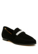Elevate your workwear and weekend wardrobe with these exquisite rhinestone-embellished penny strap loafers. Crafted from luxurious genuine suede leather, these stunning loafers offer a sophisticated take on the classic loafer silhouette with sparkling rhinestone details that catch the light beautifully.