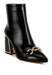 Metallic chain ankle boots for women featuring patent faux leather and metallic chain embellishment. Shiny block heel boots with metallic accent heels and pointed toe - perfect for fall, winter, and adding edge to any outfit.