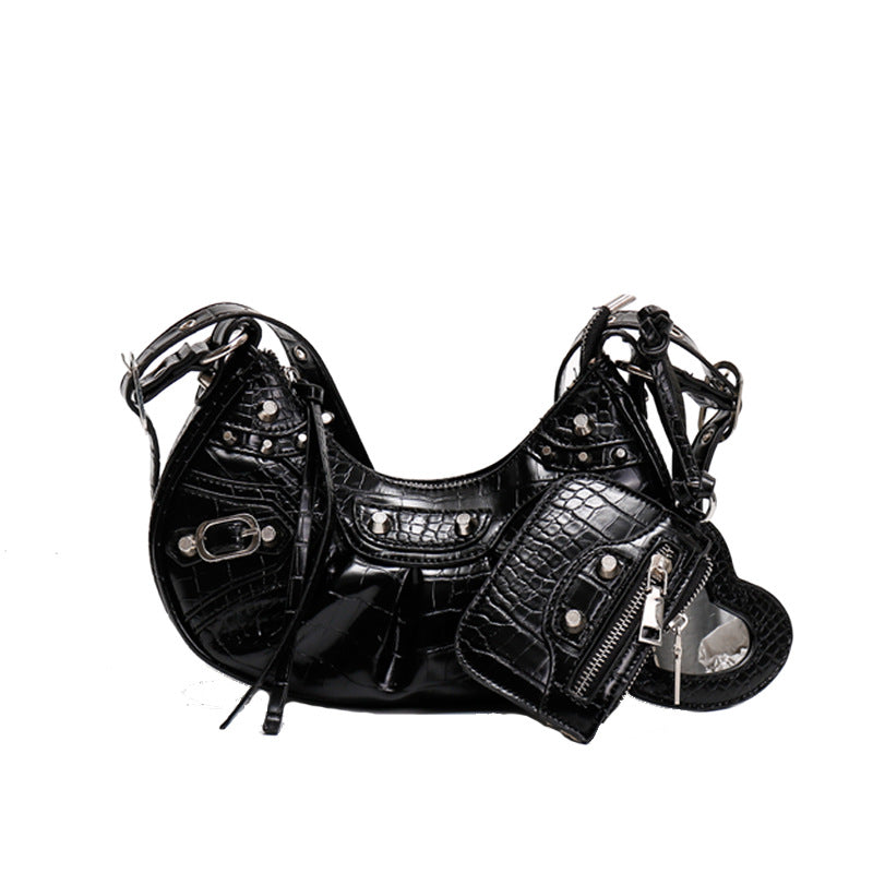 This rivet tassel crescent moon bag is the perfect fusion of artistic design and everyday practicality. The unique crescent silhouette sets you apart from conventional shoulder bags, while the rivet detailing and flowing tassel add dimensional interest that catches the eye. Whether you're building a curated accessory collection or seeking a signature piece that reflects your individual style, this bag offers exceptional craftsmanship, thoughtful organization, and distinctive aesthetic appeal. The medium-soft structure ensures comfortable all-day wear while maintaining its sculptural shape, making it an investment piece for the discerning woman who appreciates bold design with refined execution and versatile functionality.