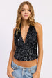 This sequin halter top is your ultimate party showstopper. Pair it with high-waisted jeans and heels for New Year's Eve glamour, or style it with a leather skirt and ankle boots for edgy night-out vibes. The halter neckline looks stunning with swept-up hair or sleek ponytail to showcase the neckline. Try it with wide-leg trousers for disco-inspired elegance, or layer under a blazer for contemporary cocktail style. Keep accessories minimal to let the sequins take center stage.