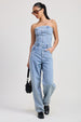 Make a bold statement with this stunning strapless denim jumpsuit that perfectly combines contemporary edge with timeless denim appeal. Crafted from 100% premium cotton, this wide-leg jumpsuit features a flattering strapless design and open back detail for a fashion-forward look. The structured bodice and flowing silhouette create an effortlessly chic aesthetic that turns heads wherever you go.