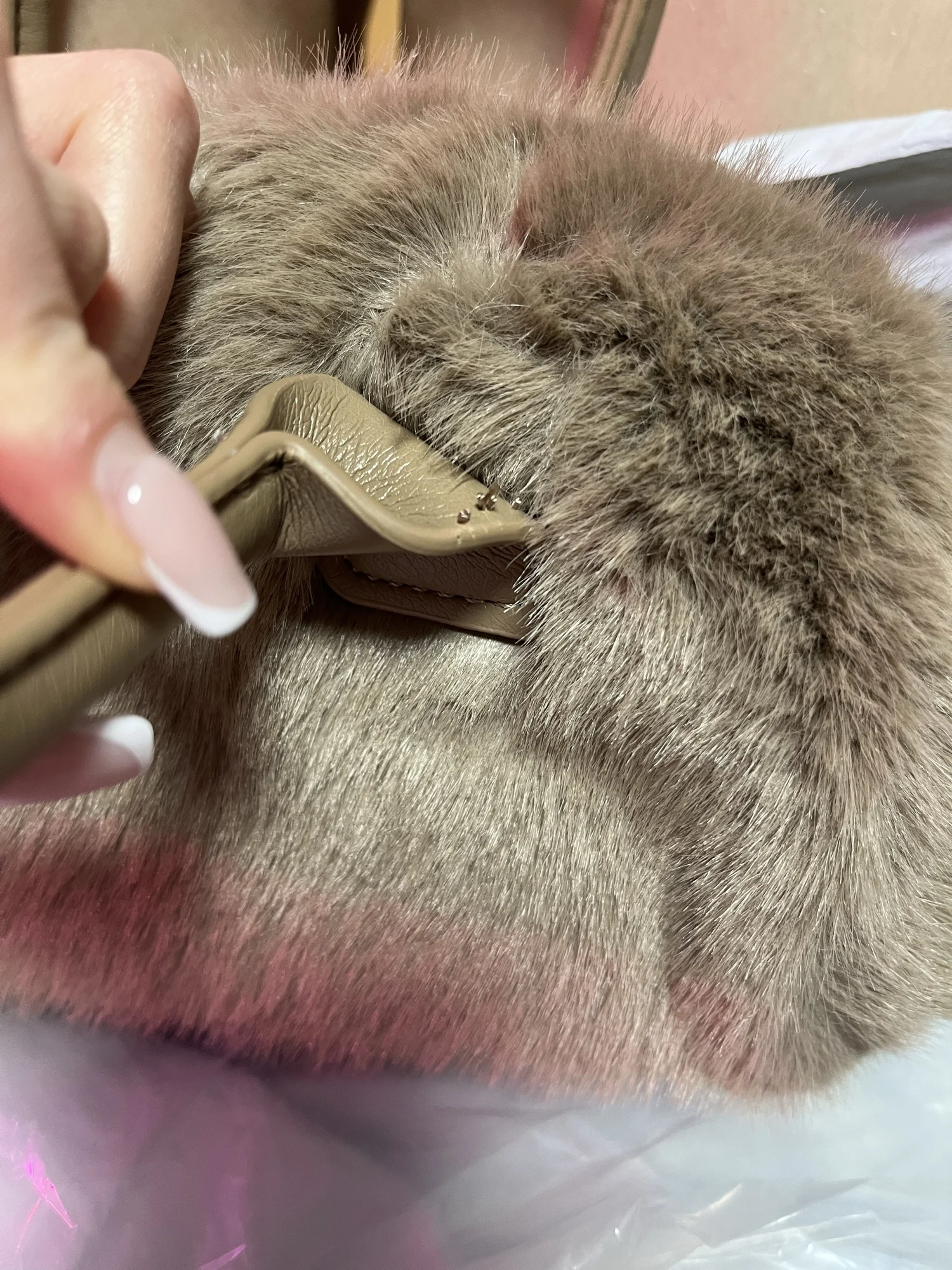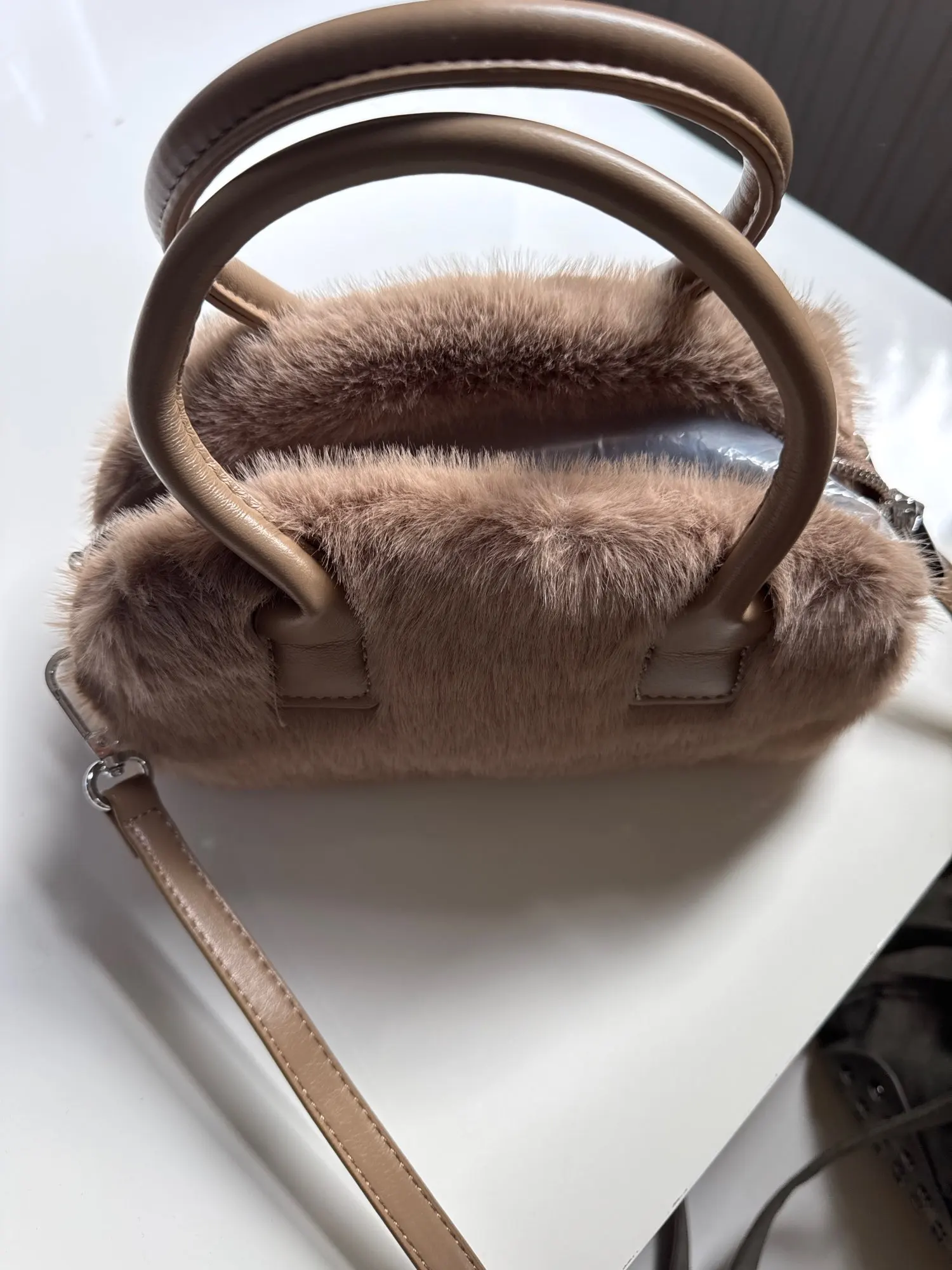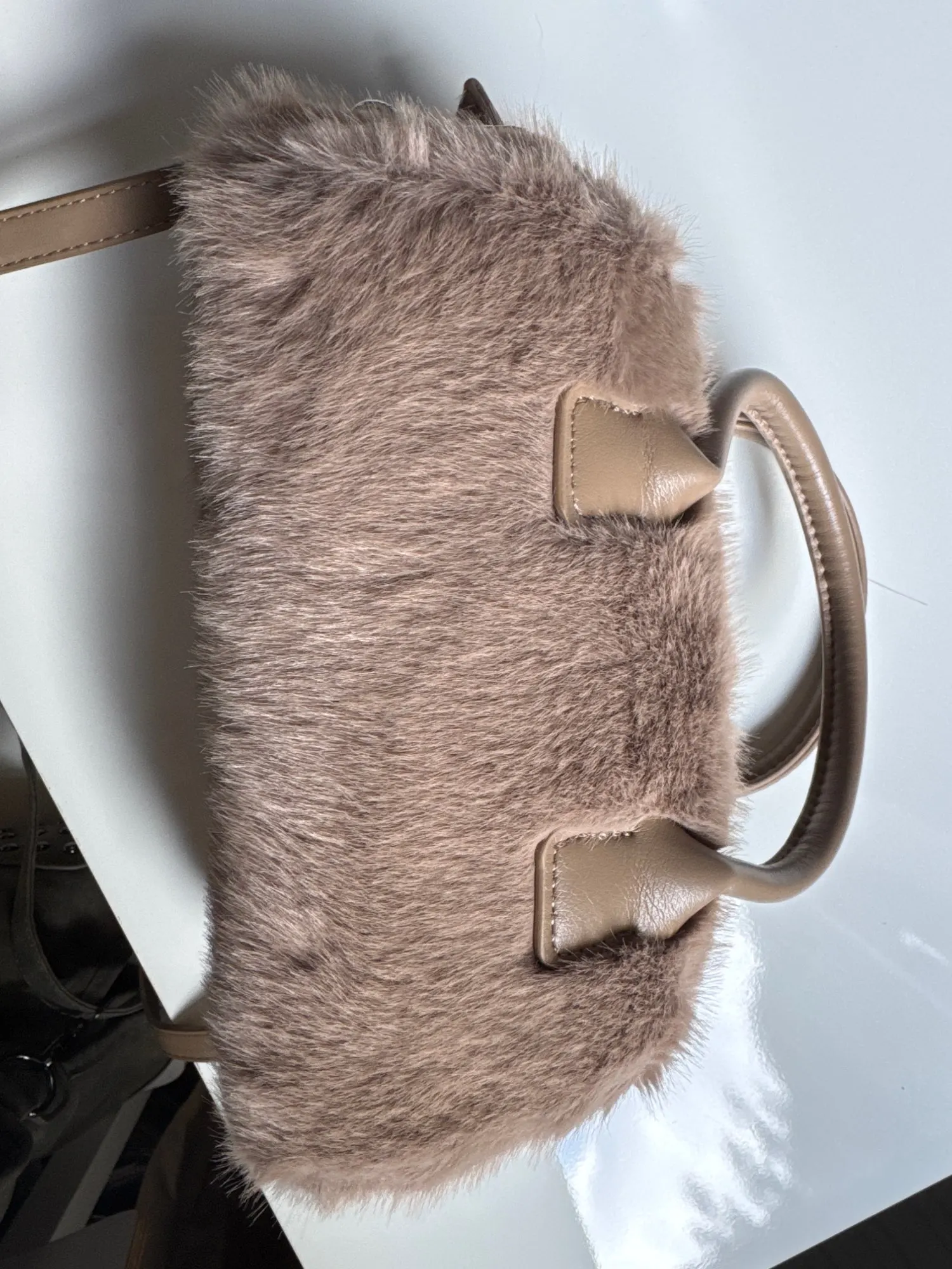 To maintain the pristine condition of your tote bag, gently spot clean with a damp cloth. Avoid prolonged exposure to direct sunlight and moisture. Store in a dust bag when not in use to preserve the faux fur detailing and overall structure.